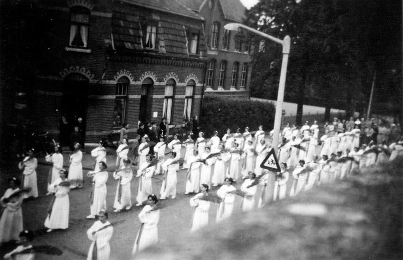 Grote maagdengroep tijdens een processie in de vijftiger jaren. Op de achtergrond het pand Bors en een gedeelte van de St. Lambertus jongensschool.