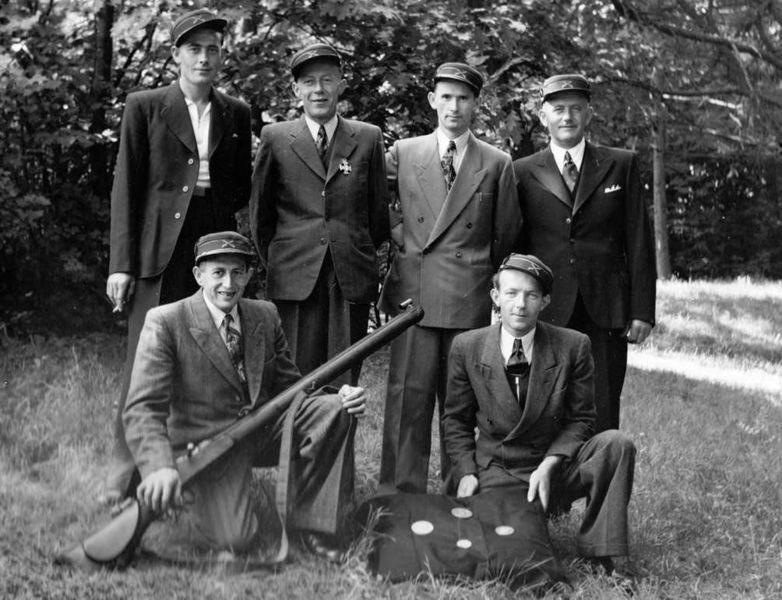 1e prijs korpsschieten. Staand vlnr: Piet Smeets, Jac Nijssen, Maan Crins, Jan Janssen. Hurkend: Jac Geerlings, Jan Nijssen.