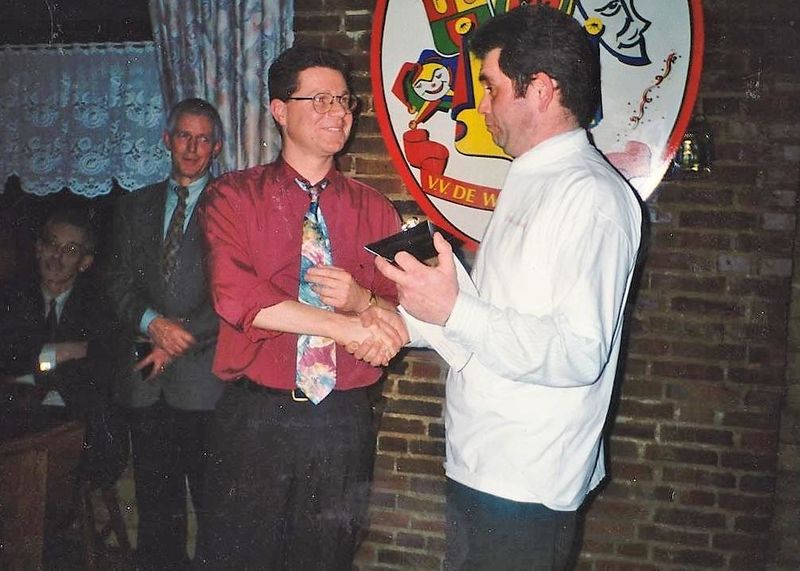 Jan Stinges krijgt uit handen van Pierre Pubben een herinneringsspeldje voor deelname feestcomité 44 jarig bestaan CV De Windjbuujels.