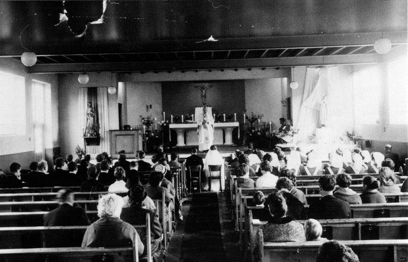 Voordat de nieuwe Fatimakerk in gebruik werd genomen moeten de parochianen en de paters Clarentijnen zich van 1956 tot 1964 behelpen in een noodkerk in zaal de Koupman. Op de foto een bruiloftsmis