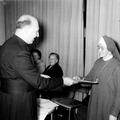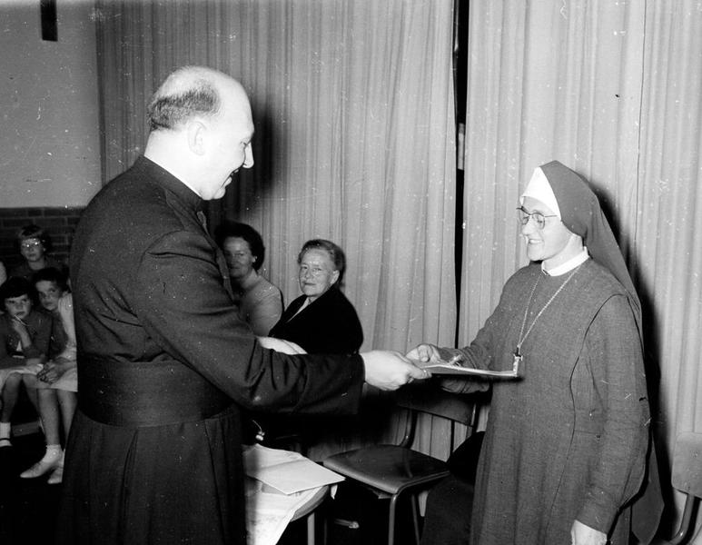 Pater Weiss overhandigt zuster Rafael Crooymans een cadeau bij haar afscheid van de Reuverse-Offenbeekse gemeenschap. Zuster Crooymans werd als medische zuster uitgezonden naar de Kongo.