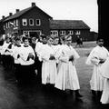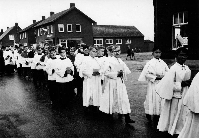 Een processie ter ere van de nieuw te bouwen Fatimakerk. Rechts het huis van Theunissen dat moest wijken voor de bouw van de nieuwe kerk