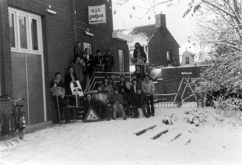 De leden van Piejus vóór hun O.J.C. Piusgebouw dat achter de Schakel lag.