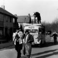 Vriendengroep Moeketoos neemt deel aan de carnavalsoptocht met een nagebouwde NOS wagen. Voorop als reporter André Janssen.