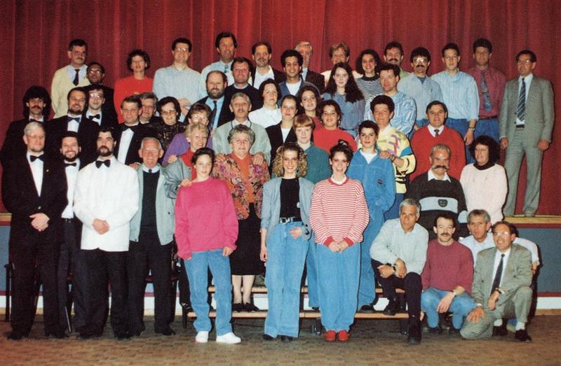 Een groepsfoto van het "Reuvers Revue Gezelschap" in de nieuwe Schakel.
