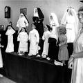 Zuster Damiana (links) legt de laatste hand aan de tentoonstelling klederdrachten van de dominicanessen. Priorin zuster Catherina kijkt toe
