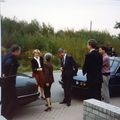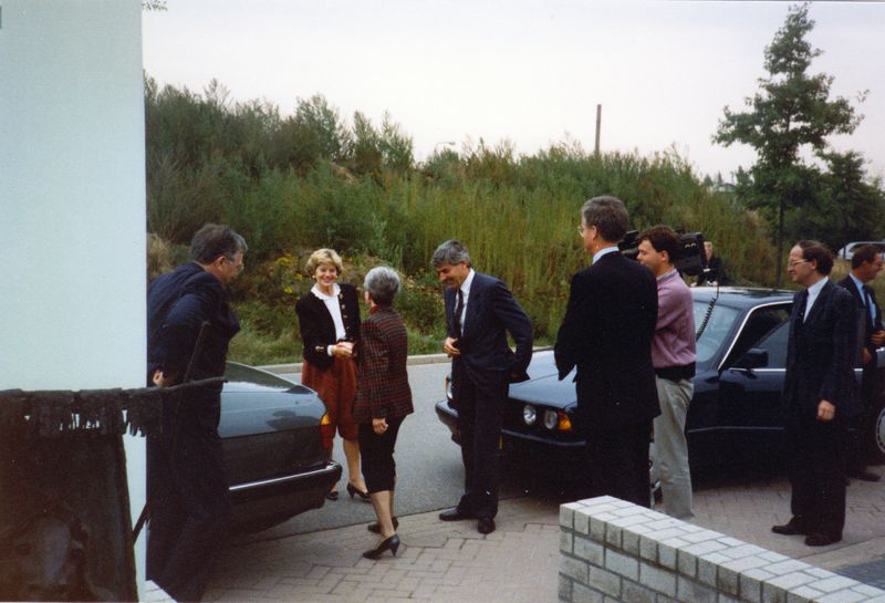 Premier Ruud Lubbers en dhr. en mevr. Kremers (gouverneur) worden ontvangen door mevr. Bertha Hovers-van Lierop bij hun bezoek aan Hovuma.