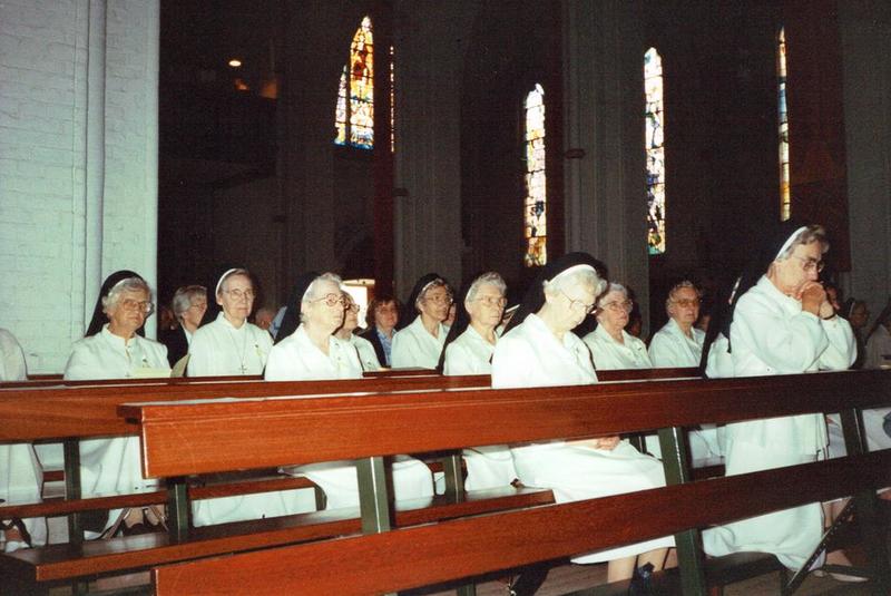 De zuster Dominicanessen in de St. Lambertuskerk tijdens de plechtige eucharistieviering ter ere van het eeuwfeest van het H. Hart Klooster.
