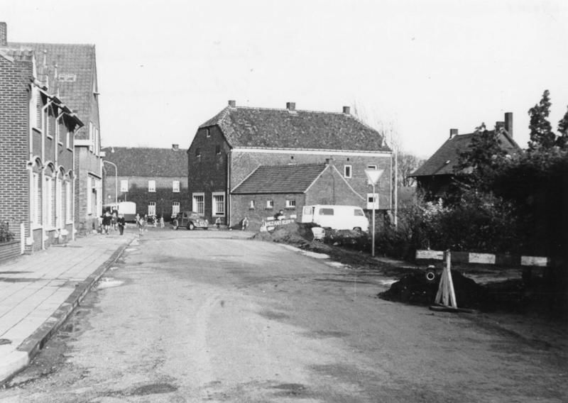 Kruising St. Antoniusstraat - Burg. Janssenstraat tijdens een verbetering weg. Op de achtergrond eetcafé De Troubadour