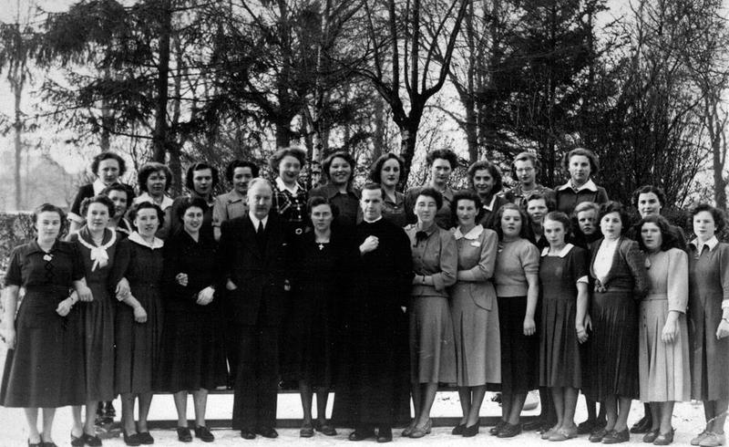 De groepsfoto werd gemaakt begin jaren vijftig bij het afscheid van de huishoudschool. De dames volgden enkele dagen in de week huishoudonderwijs. De school was toen nog in het H. Hartklooster gevestigd. In het midden kapelaan Kierkels.