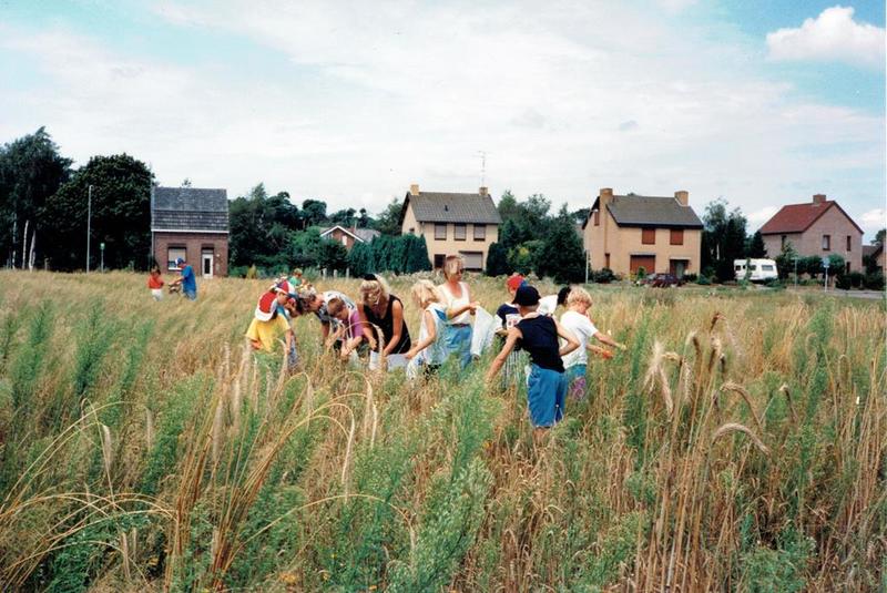 Kinderen van de Leewerveldschool gingen ouderwets (met dorsvlegel) dorsen in het gebied van Vogelsweide.