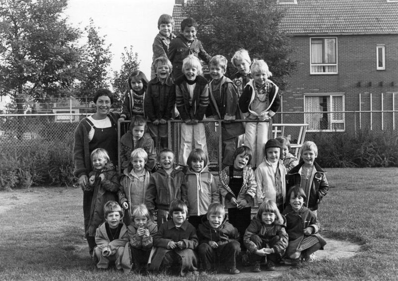 Klassenfoto van een schoolklas van de St. Jozefschool/basisschool Offenbeek met juffrouw Tiny Emans.