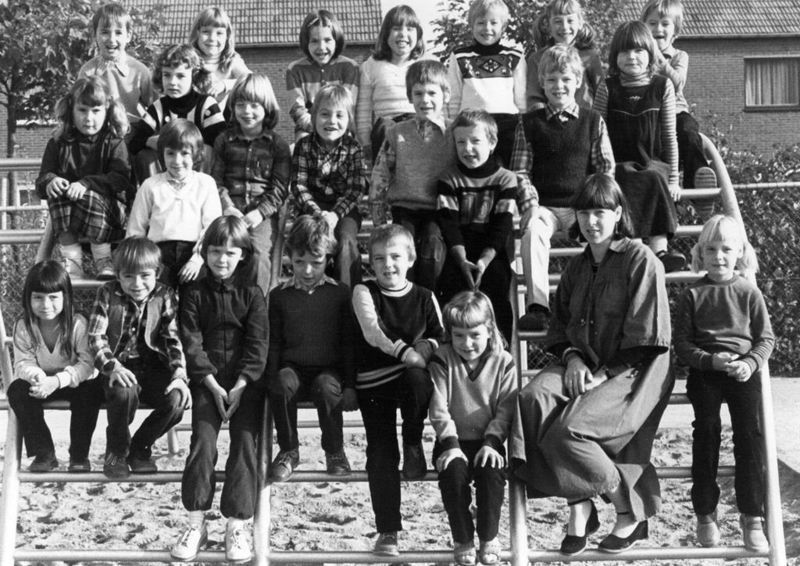 Klassenfoto van een schoolklas van de St. Jozefschool/basisschool Offenbeek met juffrouw Corrie Killaars