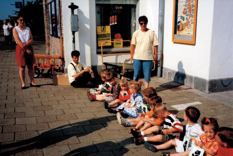De "Pinkeltjes" wachten gedisciplineerd op de komst van de trein waarmee ze op reis gaan naar Roermond. Een heel spannende ervaring voor de kleintjes.