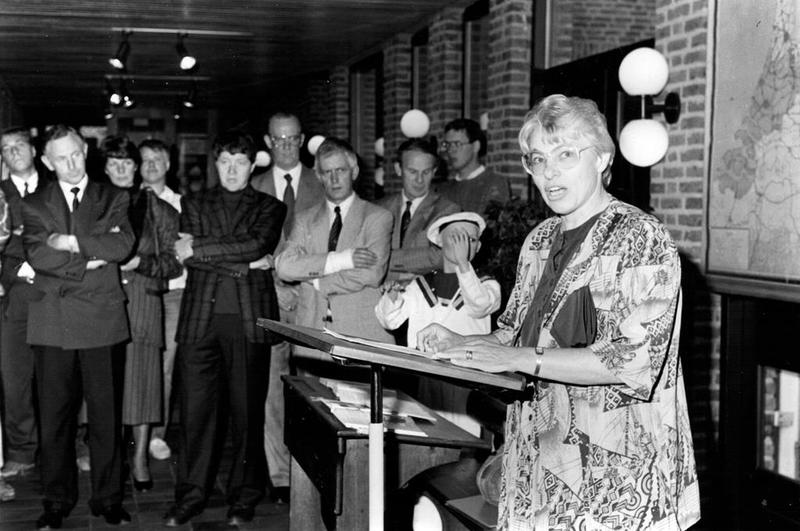 Bij de gelegenheid van het 10-jarig bestaan van de Stichting Katholiek Onderwijs Reuver werd, met het luiden van de schoolbel door wethouder Johanna van Dijk-Theunissen, een expositie geopend over het onderwijs in Reuver. In het midden wethouder Fons Verdonck.
