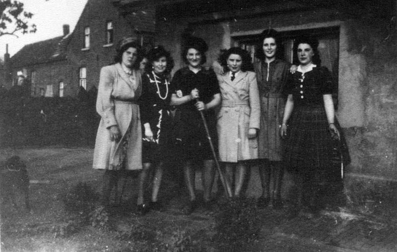 Van links naar rechts: Mia Peeters, Rien Killaars, Trees Berends, Mia Killaars, Til Lenssen en Philoméne Beerends. Op de achtergrond is nog net de slagerij van coöperatie "Ons Belang" te zien.