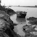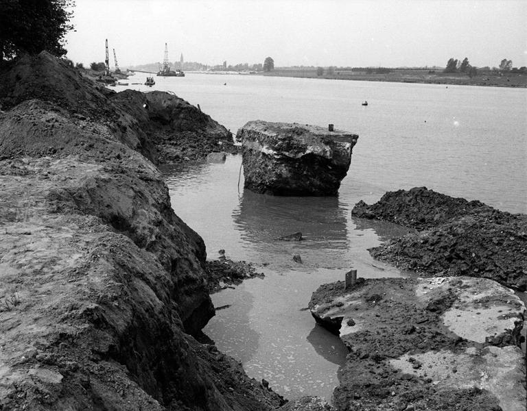Op de voorgrond de restanten van de loswal. Op de achtergrond zijn werkzaamheden bezig tegen de afkalving van de oevers van de Maas.