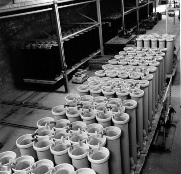 Op de voorgrond een rij ovenwagens met ongebakken gresbuizen bij N.G.I. in Belfeld.
