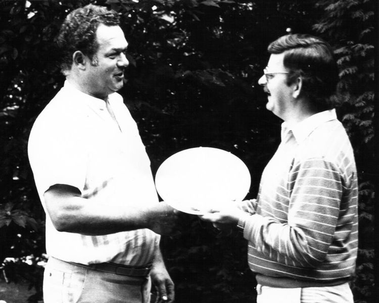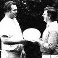 Jeu Gingter krijgt een herinneringsbord aangeboden door de voorzitter van de Stichting Kinderontspanningswerk (KOW) bij de gelegenheid van zijn 12,5 jarig lidmaatschap.