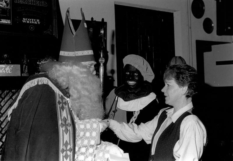 Sint Nicolaas en Zwarte Piet met een vrouwelijke bezoekster.