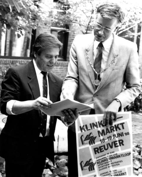 Burgemeester Nuytens en John Hermans bij de opening van de Klinkermarkt-braderie.