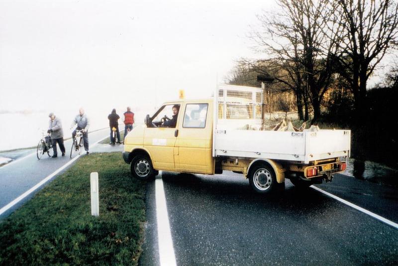 Hoog water van de Maas ter hoogte van de onderdoorgang van de Schelkensbeek onder de Rijksweg. Op de voorgrond kijkt John Kuipers vanaf de auto van de gemeente toe.