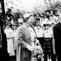 Op 14 mei 1956 was koningin Juliana op bezoek in Reuver. De koningin bracht een bezoek aan de nieuwe huishoudschool en gebruikte daar een lunch welke was klaar gemaakt door Leen Coorens uit Swalmen. Op de foto wordt ze toegezongen door de meisjes van de huishoudschool in gezelschap van burgemeester Claessen en gouverneur Houben.