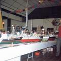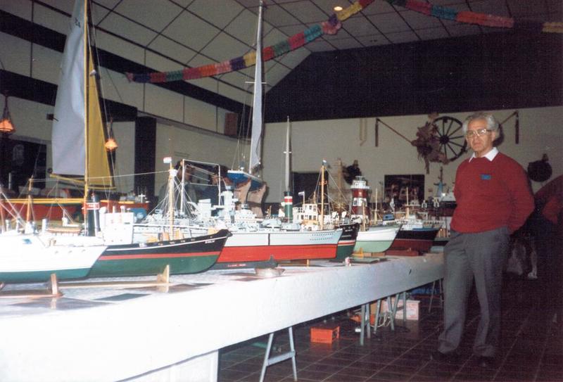 Harrie Wilms met de verzameling modelboten die door door hem en Piet Peeters eigenhandig zijn gemaakt tijdens een tentoonstelling in zaal de Harmonie in Reuver