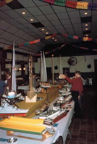 De verzameling modelboten die door door Harrie Wilms en Piet Peeters eigenhandig zijn gemaakt tijdens een tentoonstelling in zaal de Harmonie in Reuver