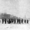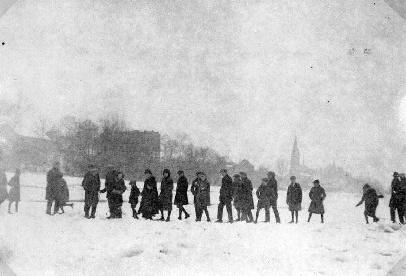 Op 17 Februari 1929 was de Maas geheel dicht gevroren en konden de mensen te voet over de Maas van Reuver naar Kessel lopen. Op de achtergrond is nog vaag de kerk van Kessel te zien.