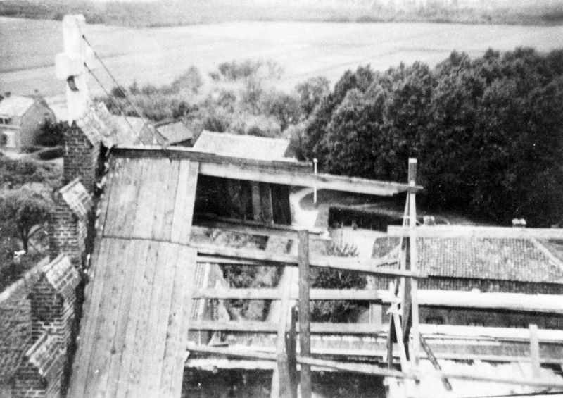 Het dak van de beschadigde Sint Lambertuskerk.