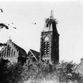 De zwaar beschadigde toren van de Sint Lambertuskerk.