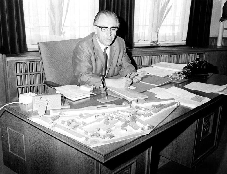 Burgemeester J.T. Hendrix met een maquette van het plan voor de bebouwde kom van Reuver.