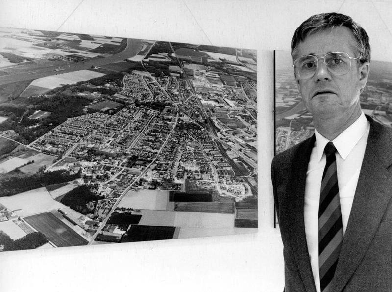 De scheidende burgemeester Nuytens staat voor een luchtfoto van de gemeente Reuver. De heer C. Nuytens was burgemeester van Beesel-Reuver van 1983 tot 1992. In 1992 werd hij benoemd tot burgemeester van Valkenburg.