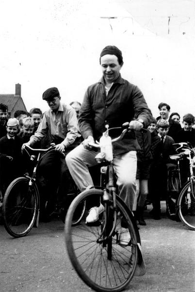 Dokter Wiek Crasborn probeert zich staande te houden op de fiets (t.g.v. de Oranjefeesten). Wiek was voorzitter van het Oranjecomité.