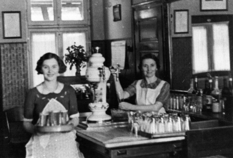 Nellie Janssen en haar dochter Lien van café Janssen bij de St. Lambertuskerk. Van 1935 tot 1960 zwaaide Nellie de scepter over dit café waarna ze deze in 1960 over deed aan Siem Ligthart. Vele jaren was café Janssen een trefpunt voor sportlui en het café het verenigingslokaal van de Reuverse voetbalvereniging.