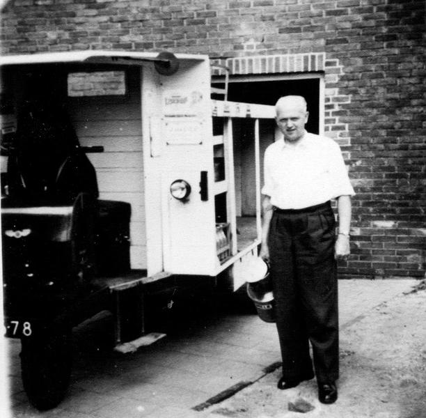 Melkboer Sjeng van Lier staat met zijn bezorgwagen in de Julianastraat. Jaren geleden een vertrouwd straatbeeld....