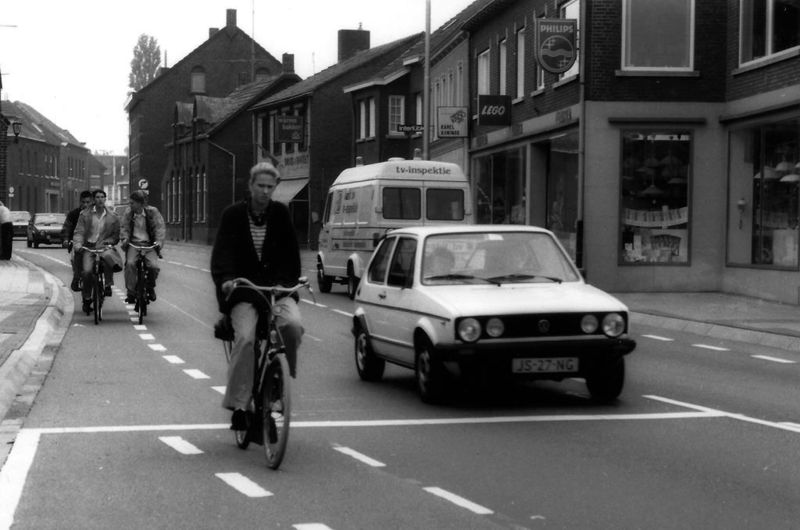 Het verkeer op de Rijksweg Zuid in Swalmen. Rechts de winkel van Karel Konings.