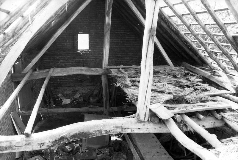 De zolder van de schuur met nog enkele stropoppen van de dakbedekking.