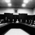 van links naar rechts : Lei Geujen, Frits Cremers, Harrie Geraedts, Sjeng Smolenaars, Kuub Simons, Piet Timmermans (notulist), Klaas de Vlieger (wethouder), Sjeng Steeghs (wethouder), Burgemeester Claessen, A. Kessels (secretaris), Leike van der Velden, Jac Laumans, Piet Vincent, Piet Lommen, Sjeng peeters en Lei Peeters. De foto is genomen in de vergaderzaal van het oude gemeentehuis.