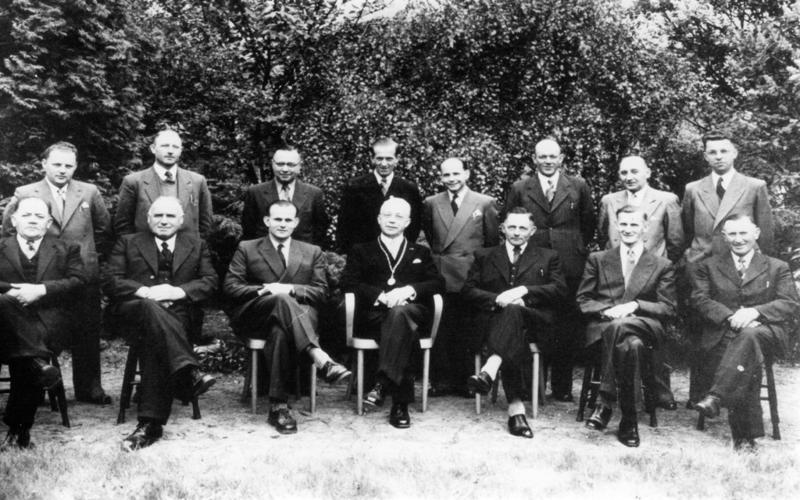 Van links naar rechts: Bovenste rij: Leike v.d. Velden, Sjeng Peeters, Harie geraedts, Piet Vincent, Piet Lommen, Lei Geujen, Frits Cremers, Jac. Laumans. onderste rij: Kuüb Simons, Sjeng Steeghs, Huub Teunissen, burgemeester Claessen, Klaas de Vlieger, v Kempen (gemeente secretaris), Sjeng Smolenaars.