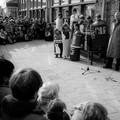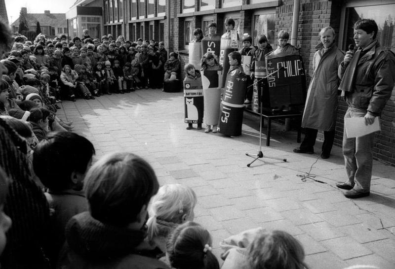 Wethouder Verdonck houdt een toespraak over het milieu voor een overwegend jong publiek.