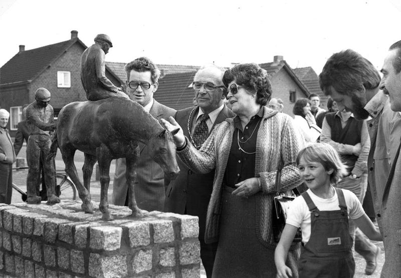 Het beeld werd in eerste instantie per ongeluk verkeerd om geplaatst met de kop richting Offenbeek (de Duitse grens) en is later omgekeerd zodat het nu (als op de foto te zien is) richting Reuver wijst. Bij het beeld links pastoor Verdonschot van Offenbeek. Verder burgemeester J. Hendrix en echtgenote.