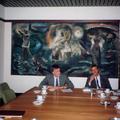 Burgemeester Nuytens en NN zitten onder het schilderij van Ella Liedrecht dat zich in het gemeentehuis bevindt.