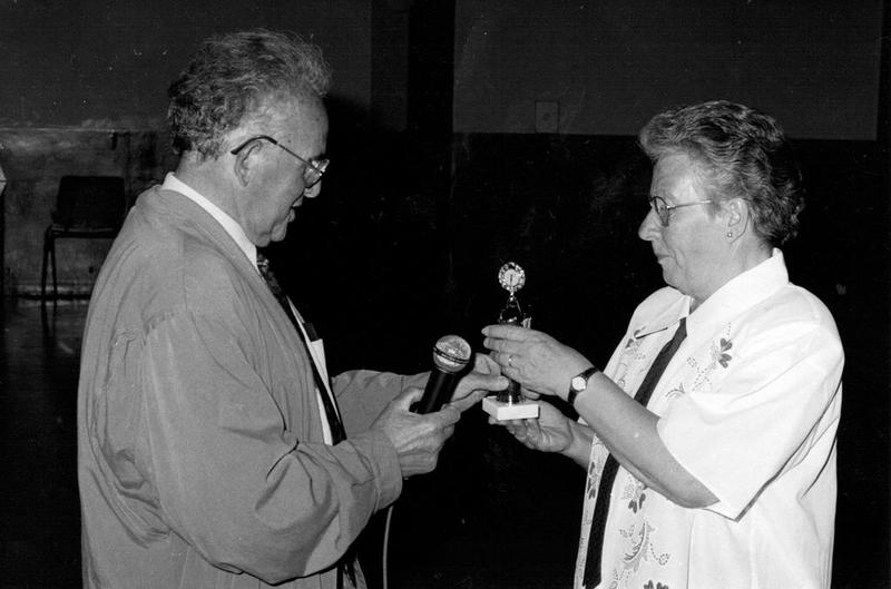 De Stichting Welzijn van Beesel, Belfeld, Offenbeek en Reuver organiseerde een fietstocht waarbij vraagstukken moesten worden opgelost. Op de foto wordt een van de prijzen uitgereikt door de heer T. Geraedts, bestuurslid van de ouderenvereniging. Beesel.