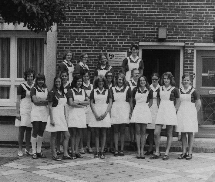 Van links naar rechts: Bovenste rij: 1 Lenie Schouren, 2 Mien Franssen, 3 Thea Koch, 4 Annie Sullen. Onderste rij: 1 Truus van de Broek, 2 Els van de Broek, 3 Liesa Crommentuyn, 4 Annie verstappen, 5 Nellie Rovers, 5 Mia Strouken, 6 Jeanne Franssen, 7 Truus Berden, 8 Carla Kessels, 9 Bonnie Strouken, 10 Ans Custers, 11 Els Franssen, 12 Mariet Houwers, 14 Francien van Heugten. De gezinszorg zat destijds in het Groene kruis gebouw.