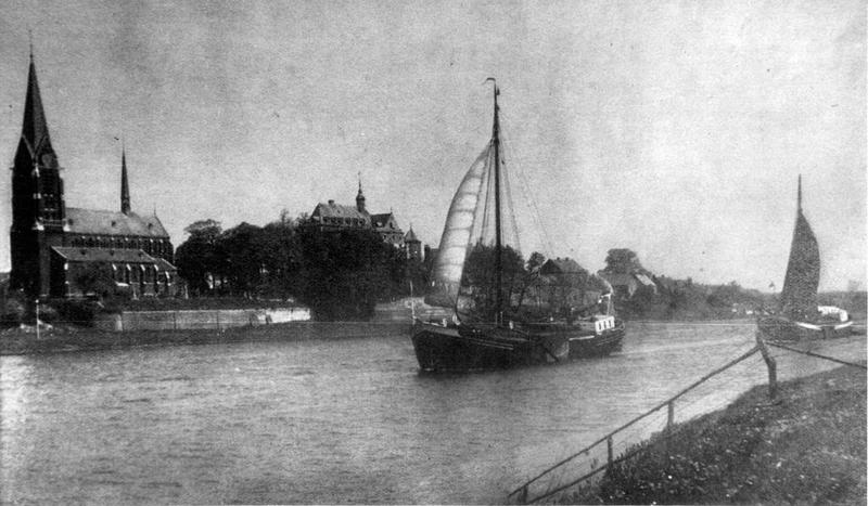 Vervoer per zeilschip op de Maas tussen Kessel en Reuver. Op de achtergrond de kerk en kasteel De Keverberg.