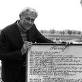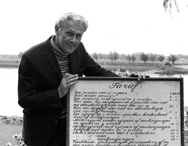Veerman Tony Beeks die veertig jaar lang het veer tussen Kessel en Beesel/Reuver bestuurde met nog een oud handgeschreven bord met de veerprijzen.