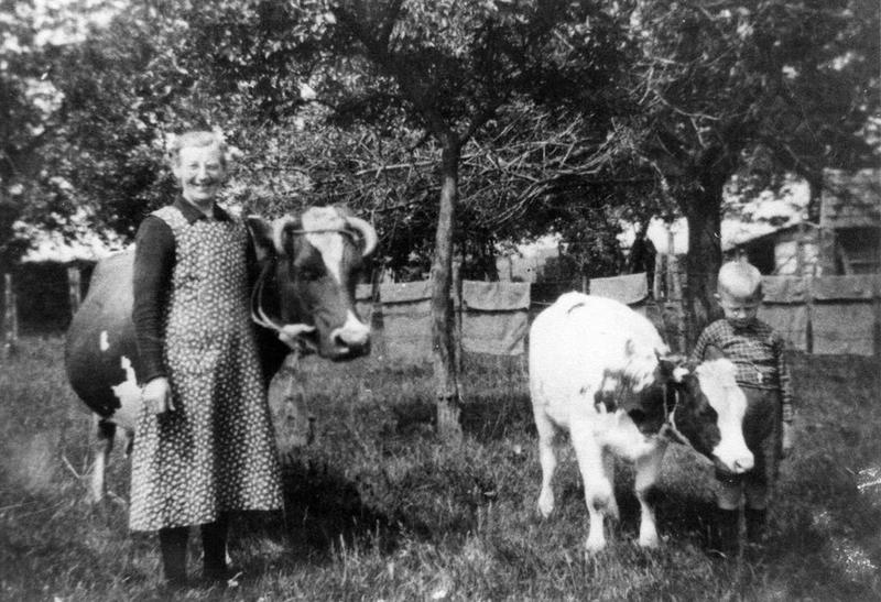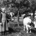 Lien Dewinden, vrouw van Handrie Dewinden (Windes-Handrie) in haar schik met een koe en een kalf bij hun boerderij.