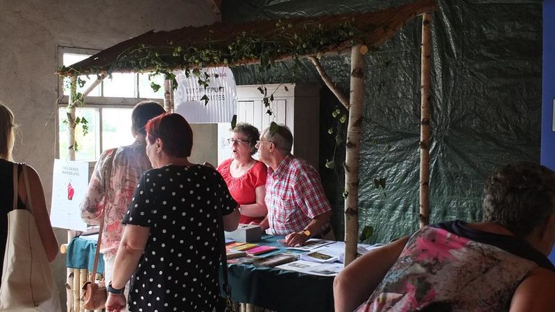 Op Open Monumenten Dag werd in de schuur een diavoorstelling verzorgd en was er live muziek te horen. Op de foto staan Hennie Geurts-Willemsen en Jan Geerlings achter de stand van de Heemkundevereniging.